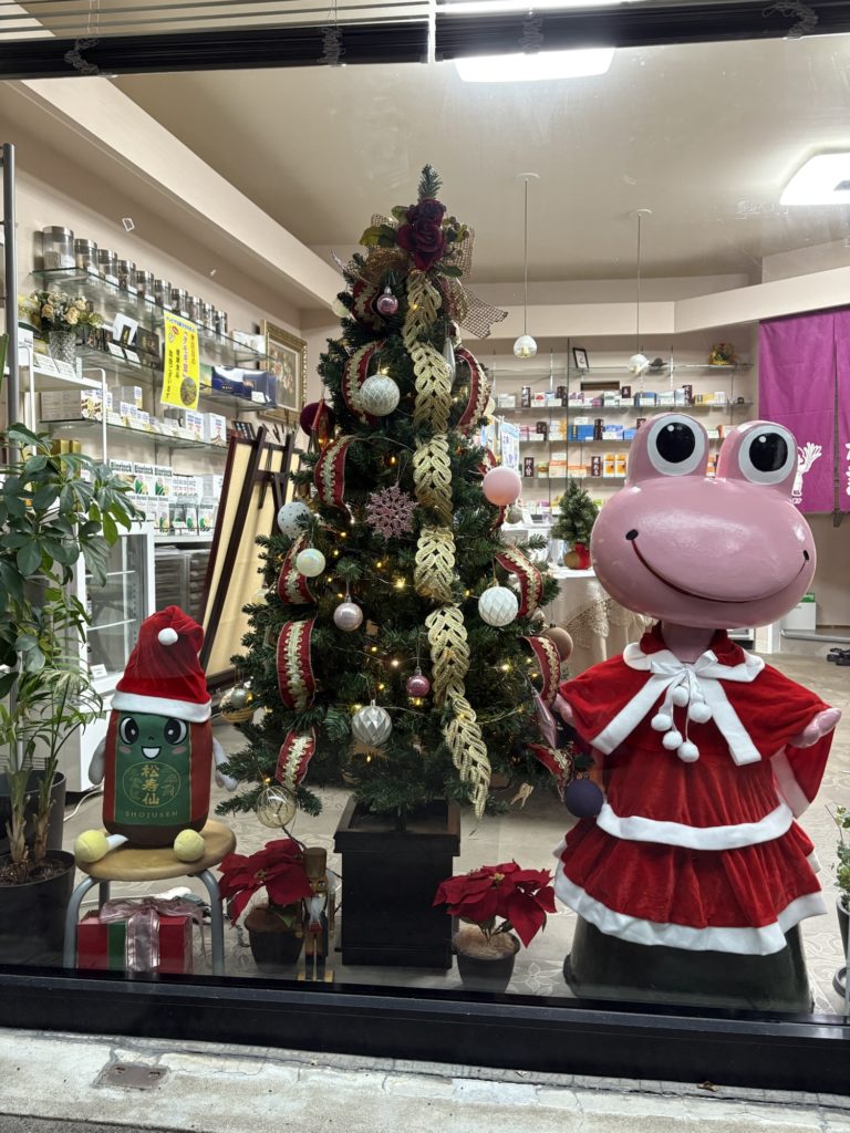 今年は、松寿仙のマスコットキャラクターの松ちゃんにサンタさんの帽子をかぶせてみました。