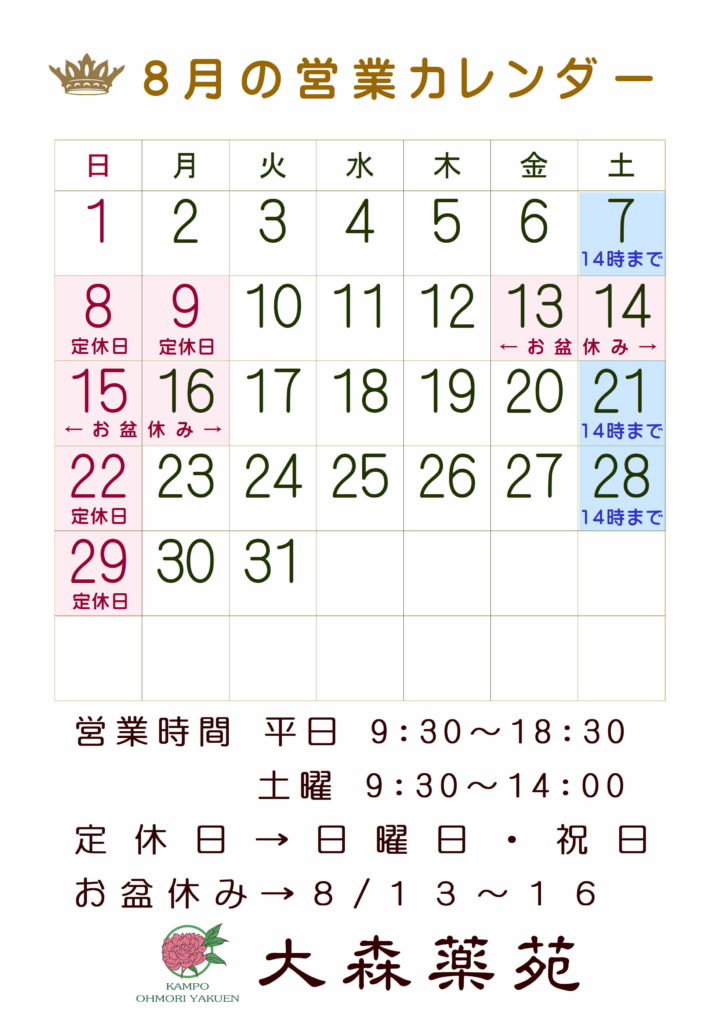 8月の営業予定は下記の通りです。どうぞよろしくお願い致します。