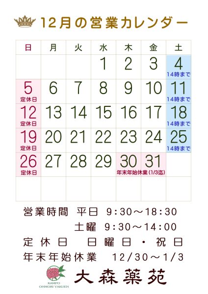 12月の営業予定は下記の通りです。どうぞよろしくお願い致します。