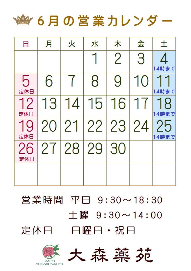 6月の営業予定は下記の通りです。どうぞよろしくお願い致します。