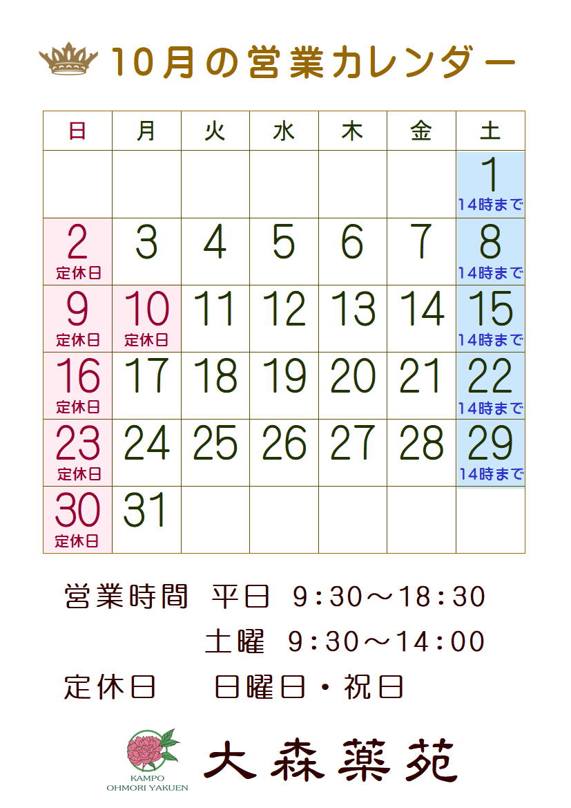 10月の営業予定は下記の通りです。どうぞよろしくお願い致します。