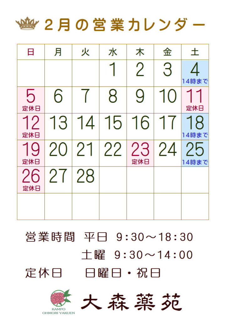 2月の営業予定は下記の通りです。どうぞよろしくお願い致します。