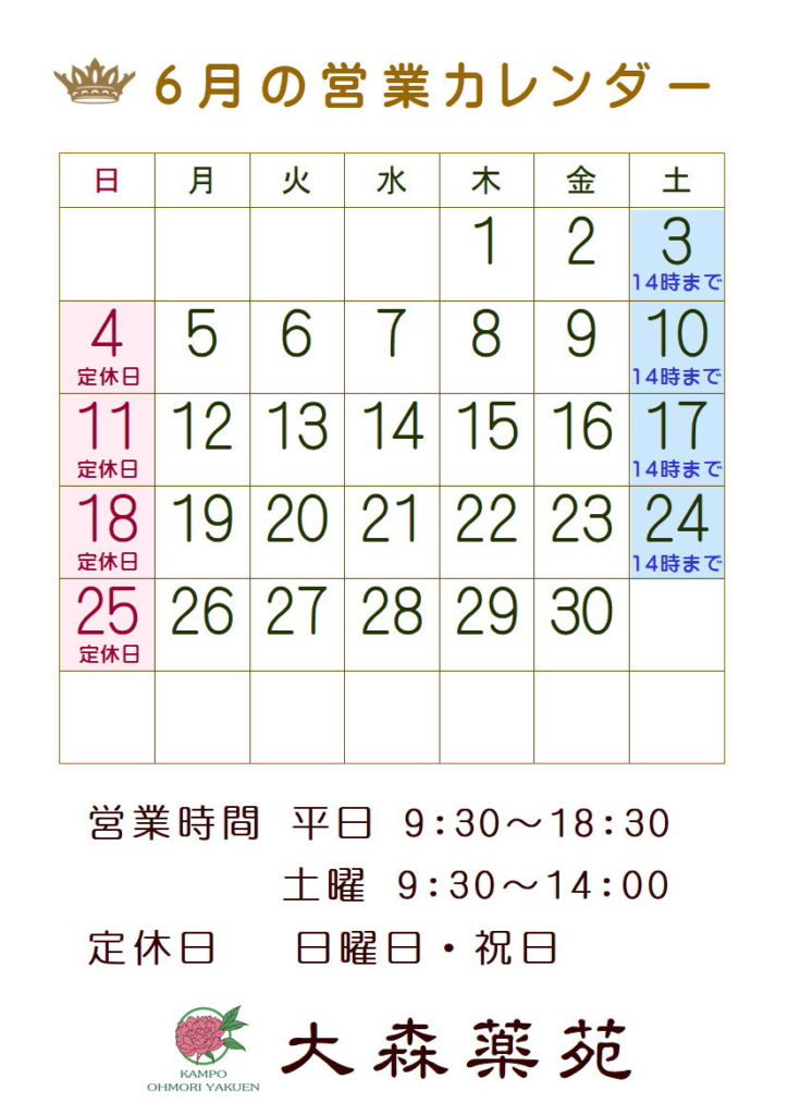 6月の営業予定は下記の通りです。どうぞよろしくお願い致します。
