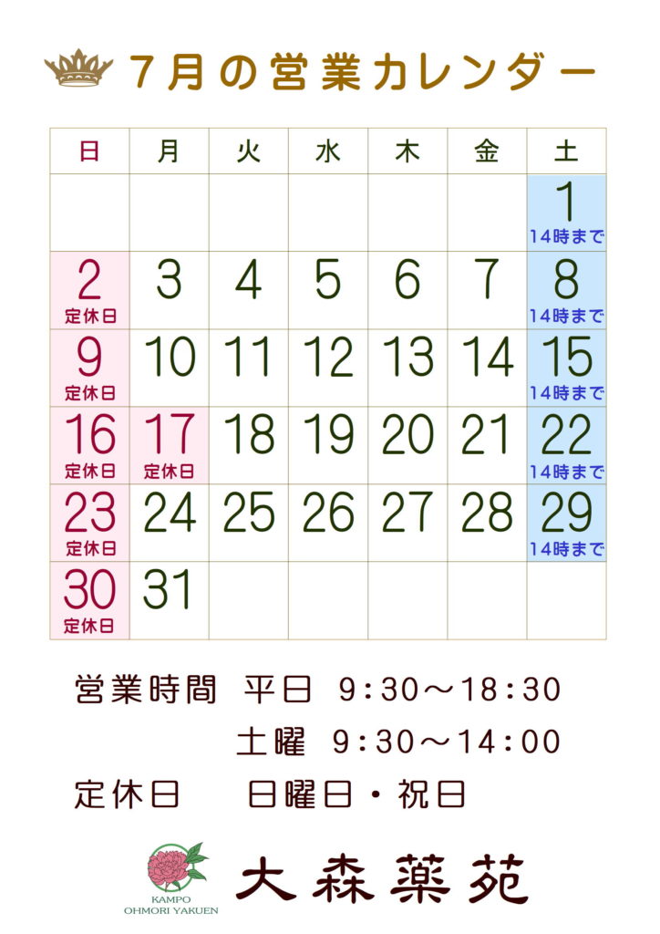 7月の営業予定は下記の通りです。どうぞよろしくお願い致します。