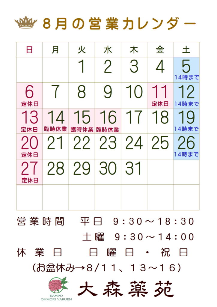 8月の営業カレンダー