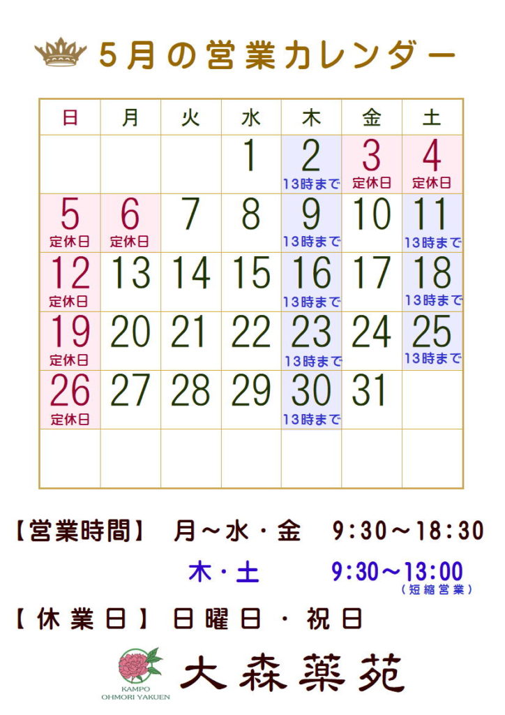 5月の営業カレンダー