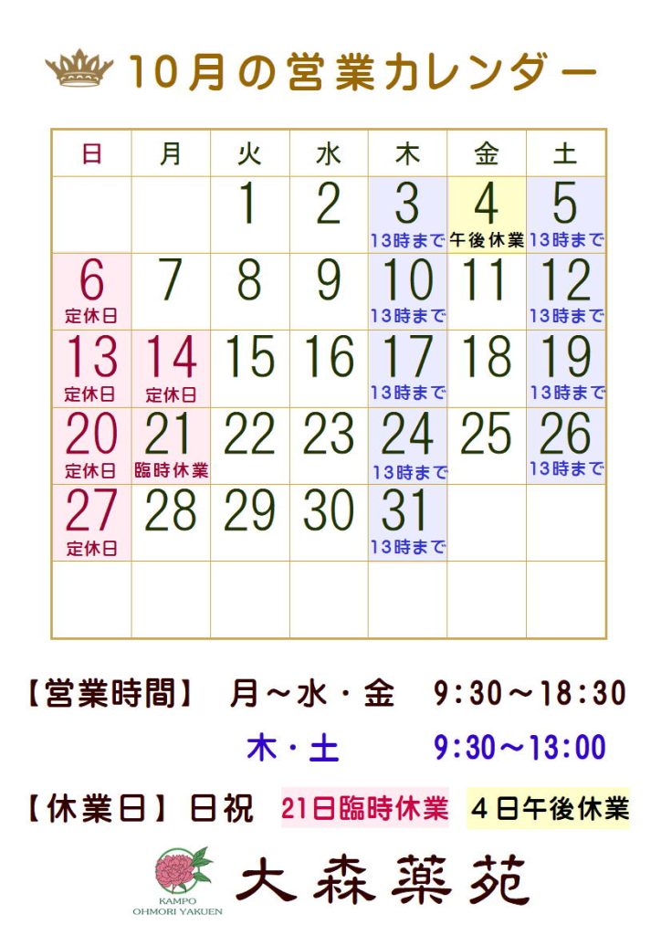 10月の営業カレンダー