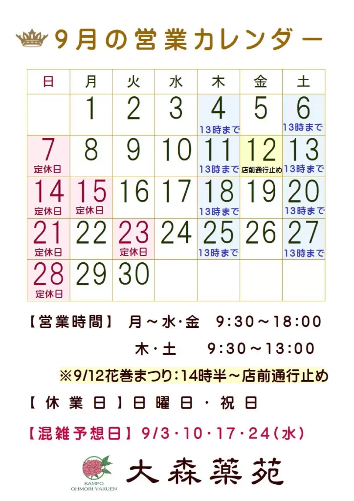 9月の営業カレンダー