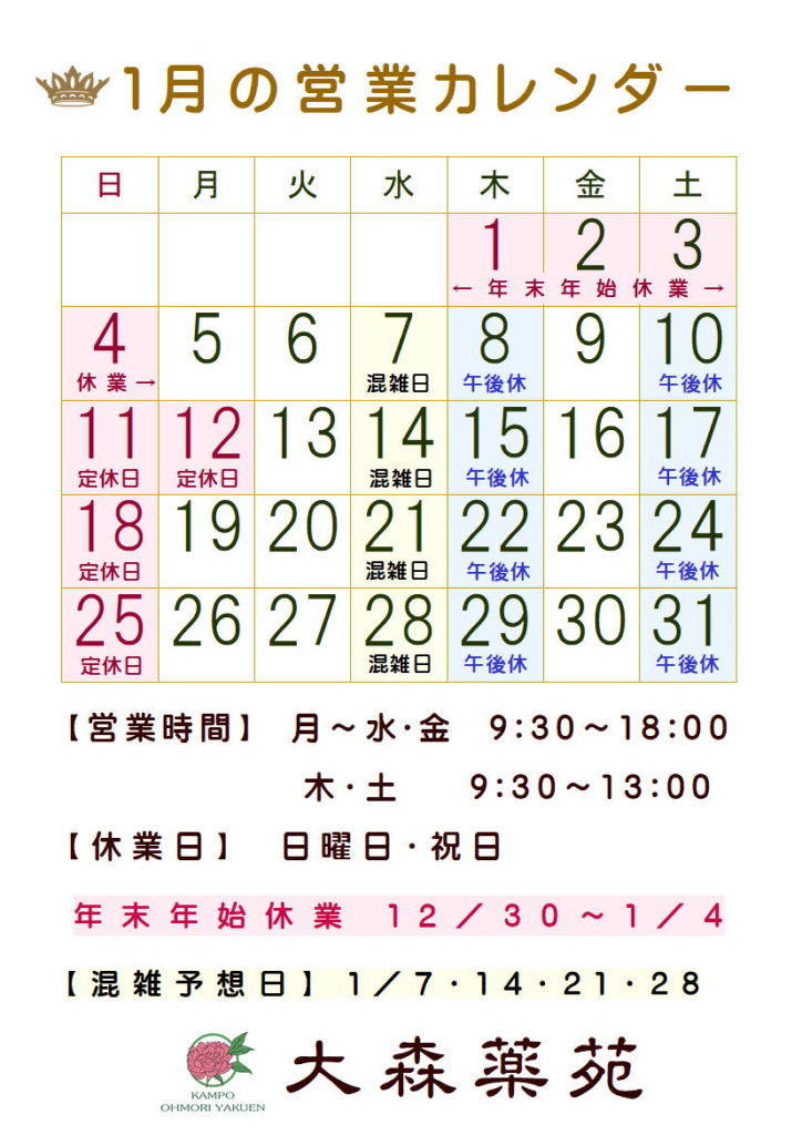 年末年始休業と1月の営業カレンダー