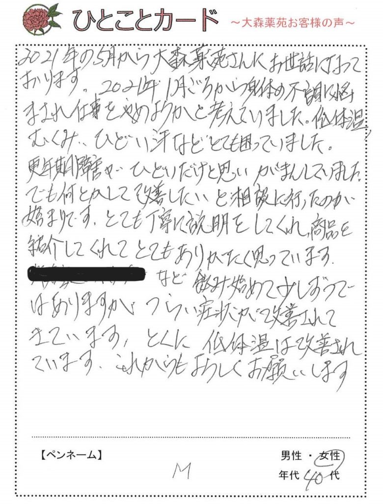 初めてご来店いただいた時には、ほてりや滝のような汗・むくみ・低体温など、本当にお困りでした。