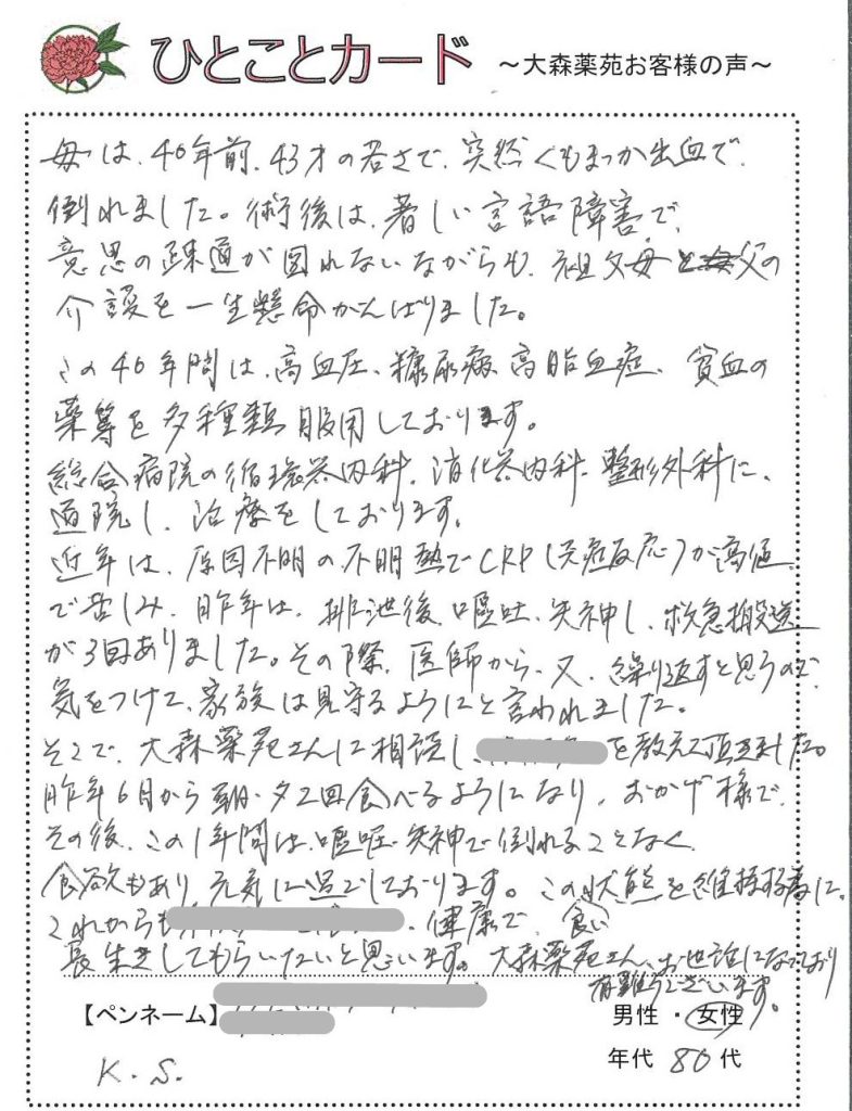 そこで、大森薬苑さんに相談し、サプリメントを教えていただきました。昨年6月から、朝夕2回摂取するようになり、お陰様で、その後、この1年間は嘔吐失神で倒れることなく、食欲もあり、元気に過ごしております。