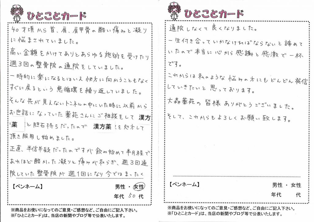 漢方薬と自然薬を服用後1か月頃から、上記の症状はほとんど改善されていましたが、H29年6月に「首肩の凝りがひどいのだけが悩み」と相談されました。以前から服用していたもの加えて、2種類の漢方薬を処方したところ、嘘のように首肩の凝りが無くなったそうです。