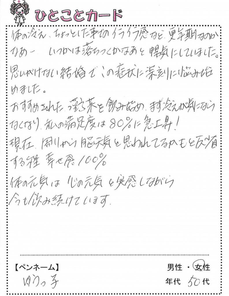 冷え、イライラ感、体力がない・・と、大変気落ちなさっていました。