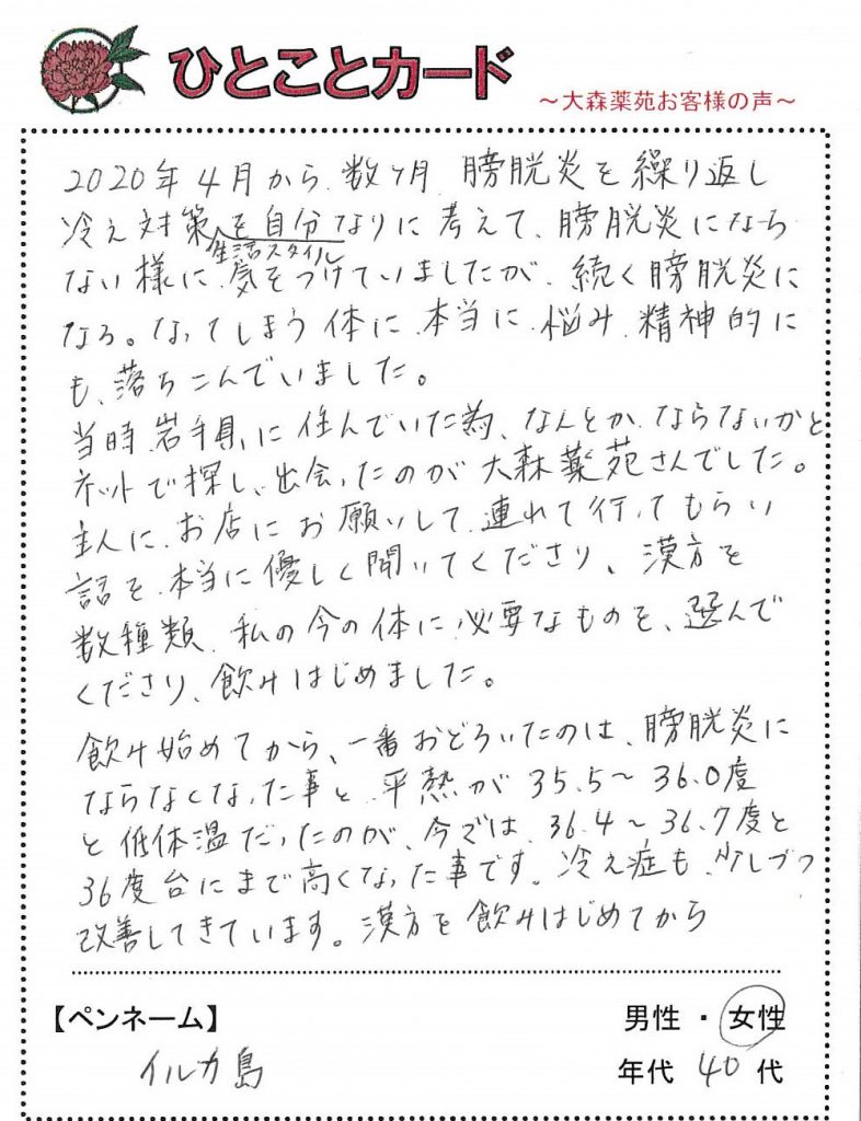 2020年10月ごろからやっと体の状態が安定してきたところです。本当に漢方にそして大森薬苑さんに出会えて良かったです。