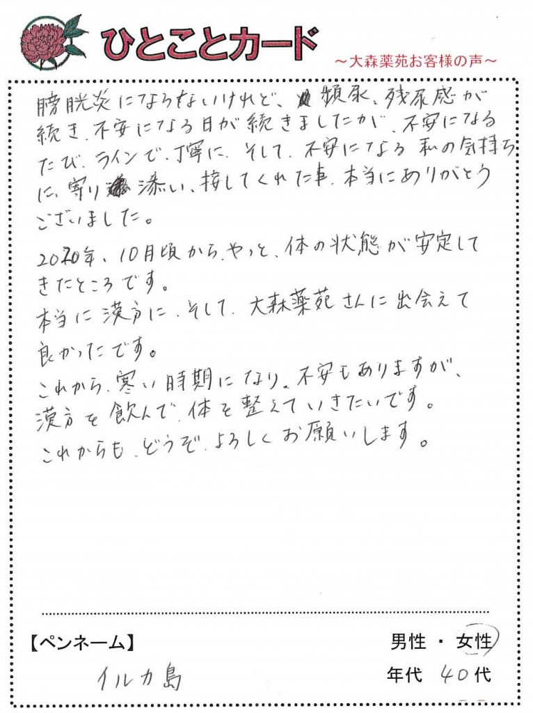 漢方飲み始めてから膀胱炎にならないけれど、頻尿残尿感が続き、不安になる日が続きましたが、不安になるたび、ラインで丁寧にそして不安になる私の気持ちに寄り添い接してくれた事、本当にありがとうございました。