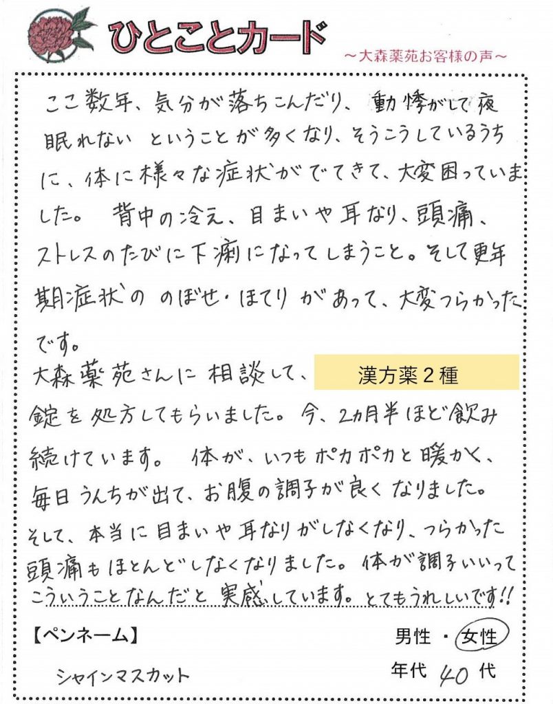 ここ数年、気分が落ち込んだり、動悸がして夜眠れない、ということが多くなり、そうこうしているうちに、体に様々な症状が出てきて、大変困っていました。