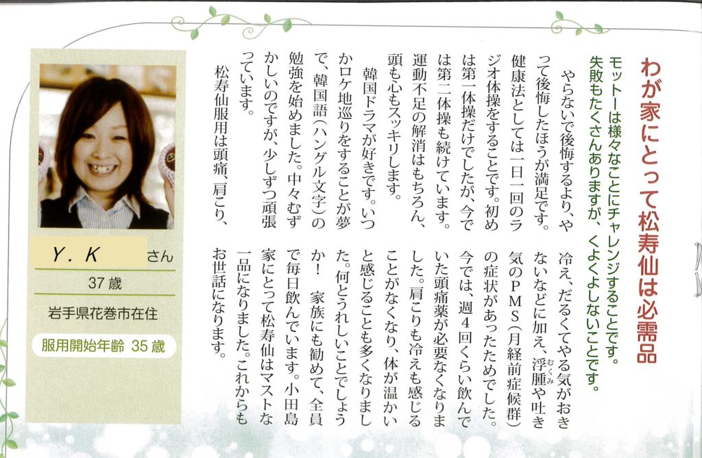松寿仙服用は頭痛、肩こり、冷え、だるくてやる気がおきないなどに加え、浮腫や吐き気のPMS(月経前症候群)の症状があったためでした。